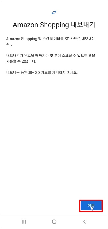 선택한 어플의 내보내기 메뉴가 열립니다. 하단에 [이동] 버튼을 클릭하시면 sd 카드로 이동합니다.