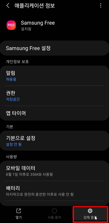 선택한 앱의 상세 화면이 나옵니다. 메뉴 중 [강제 중지]를 선택합니다.