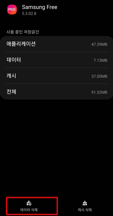 저장 공간 화면이 나오면 현재 사용 중인 데이터 용량이 나오게 됩니다. [데이터 삭제]를 선택합니다.