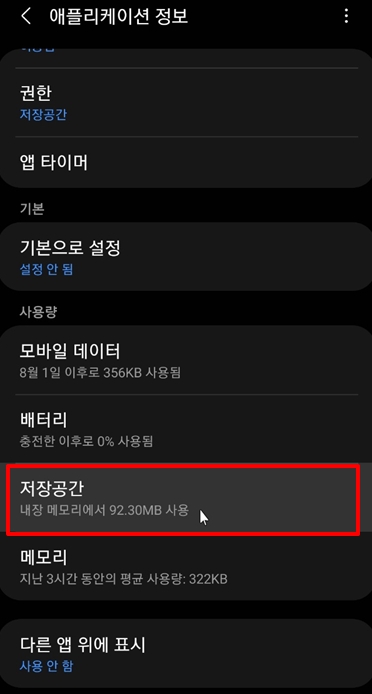 다시 앱 상세 화면에서 이번엔 [저장 공간]을 선택합니다.
