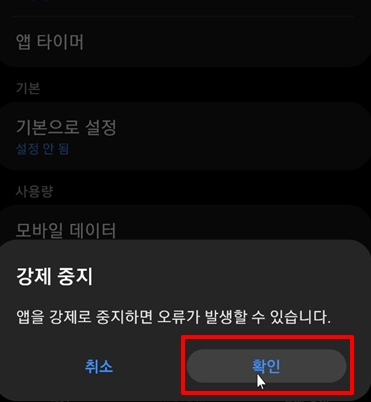 강제 중지 안내 메시지가 나오면 [확인] 버튼을 눌러주세요..
