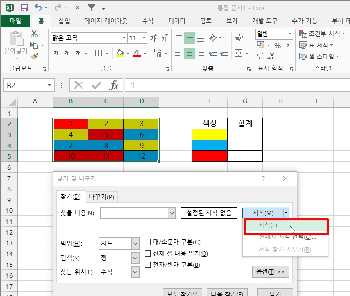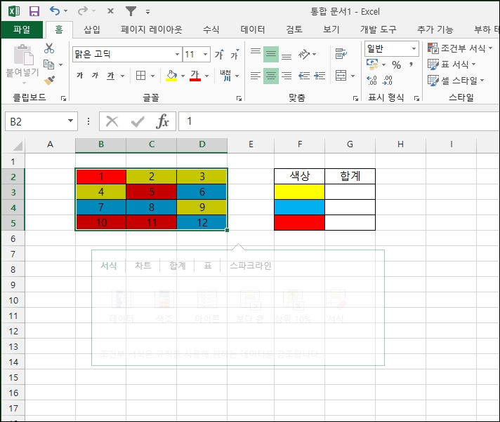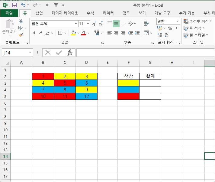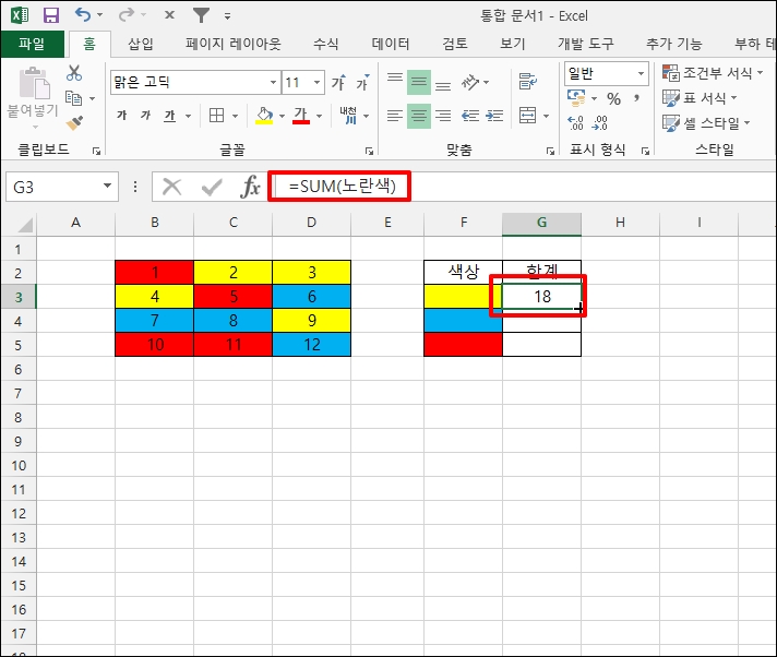 셀에 적용된 배경색별로 합계를 구해보도록 하겠습니다.