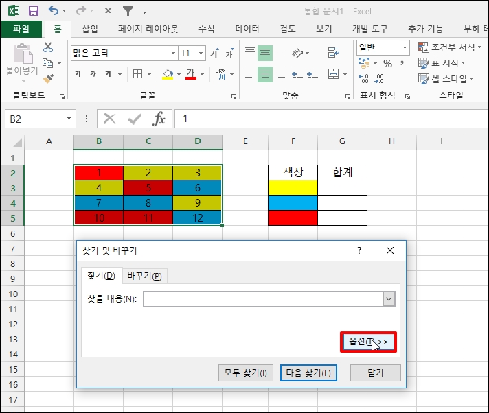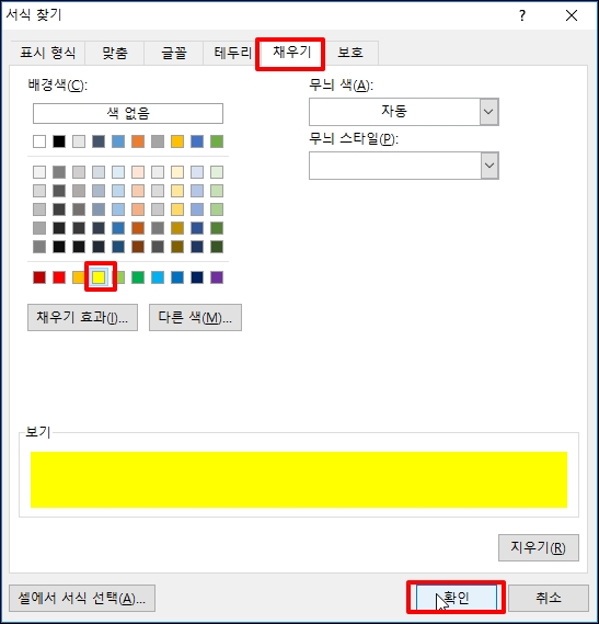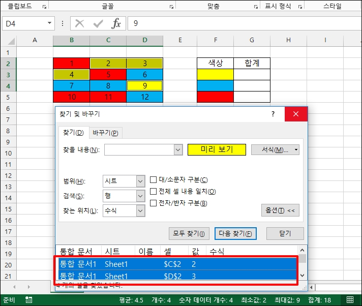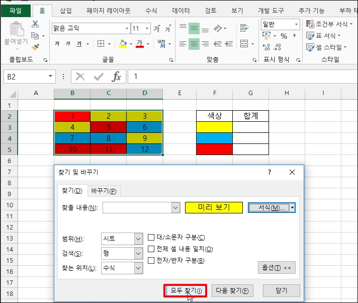 하단에 선택한 색상의 셀이 모두 검색됩니다.