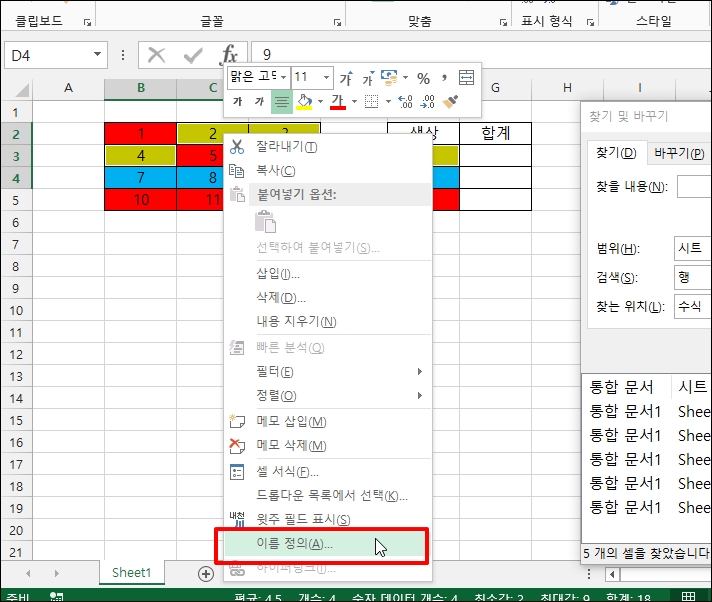 선택된 셀에서 마우스 오른쪽 버튼을 클릭 후 메뉴가 열리면 [이름 정의]를 선택합니다.