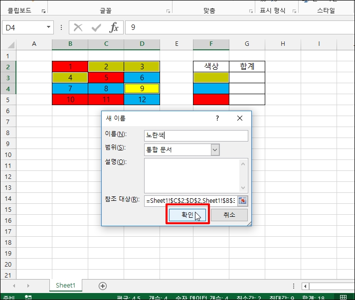 색상이 나오면 합계를 구하려는 색을 선택 후 [확인]을 클릭합니다.
