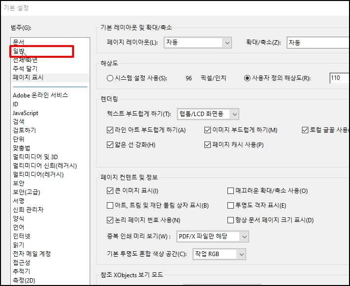 우측 일반 항목이 나오면 [Windows 탐색기에서 PDF 섬네일 미리 보기 사용]에 체크해주세요.