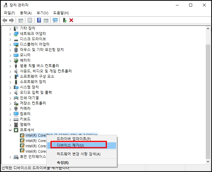 윈도우 장치 관리자 프로세서 CPU 느낌표 코드 32 오류 해결 방법