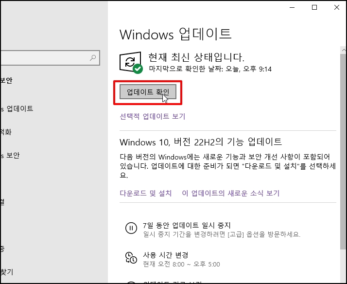 Windows 업데이트 화면으로 이동하면 최신 버전인지 아니라면 최신 버전을 다운로드합니다.