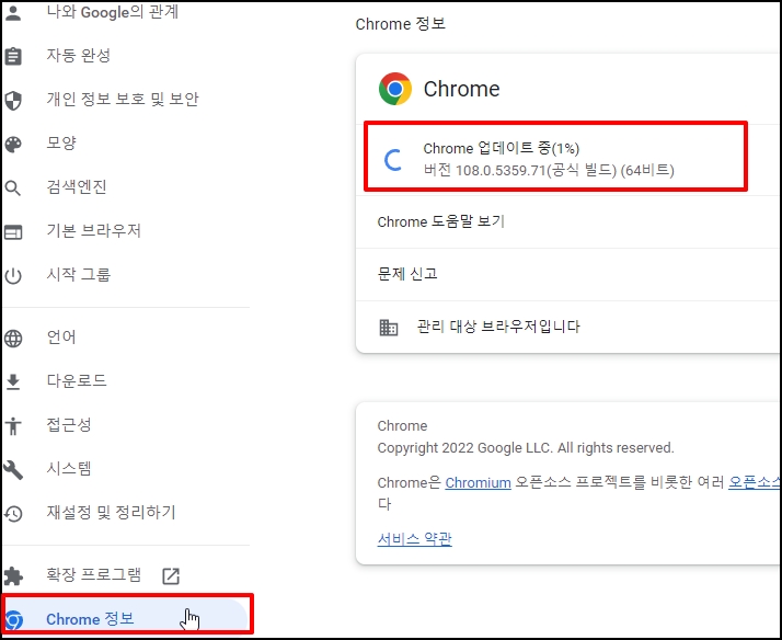 설정 화면이 나오면 좌측 메뉴 중 [Chrome 정보]를 클릭해주세요
