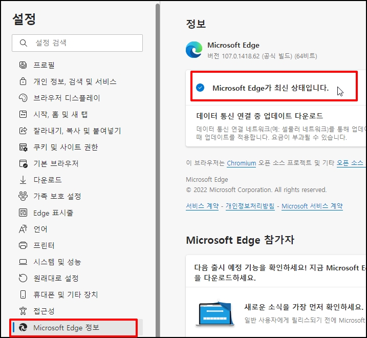 설정 화면으로 이동하면 좌측 메뉴 중 [Microsoft Edge 정보]를 클릭해주세요