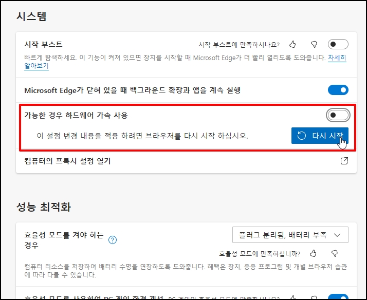 시스템 항목에서 [가능한 경우 하드웨어 가속 사용] 기능을 [끔]으로 합니다.