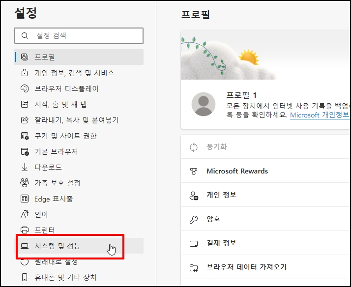 설정 화면으로 이동하면 좌측 메뉴 중 [시스템 및 성능]을 클릭합니다.