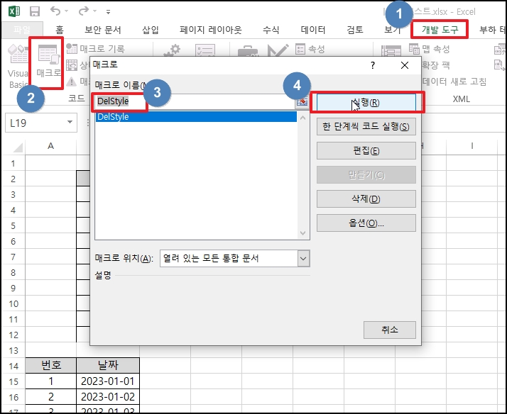 매크로 창이 열리면 생성한 "DelStyle"를 선택 후 [실행] 버튼을 클릭하시면
