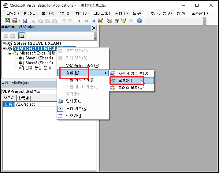 [VBA Project]에 마우스 오른쪽 버튼을 클릭 후 [삽입]-[모듈]을 선택합니다.