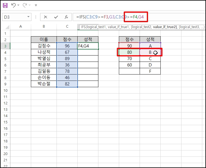 성적을 입력 할 "d3" 셀에 "=IFS(" 를 입력 후 점수가 입력된 영역을 지정하거나 입력합니다.
