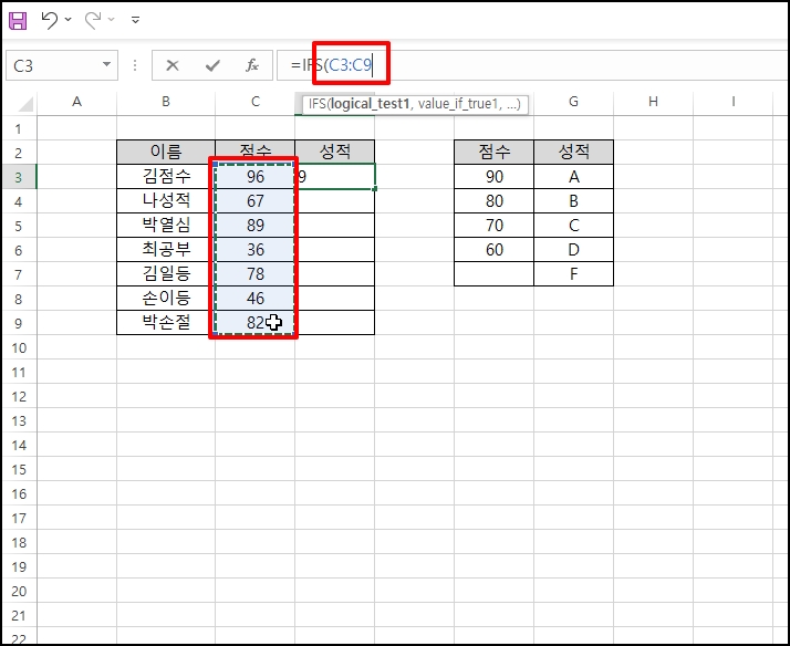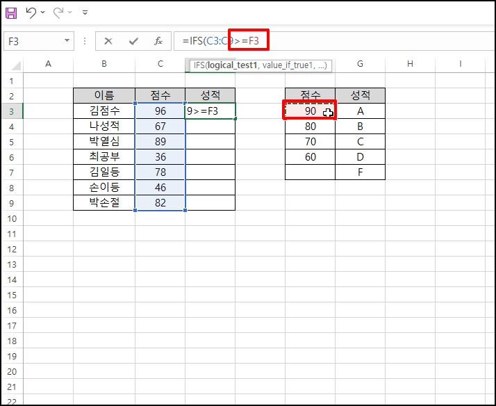 90점이 입력되어 있는 "F3"를 참조해서 =IFS("C3:C9>=F3를 입력합니다.