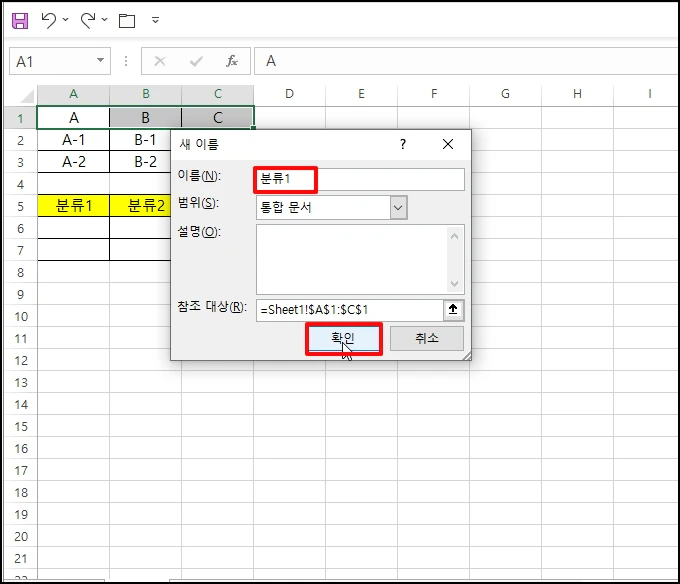 새 이름 창이 열리면 이름에 "분류1"을 입력 후 [확인] 버튼을 클릭해 주세요