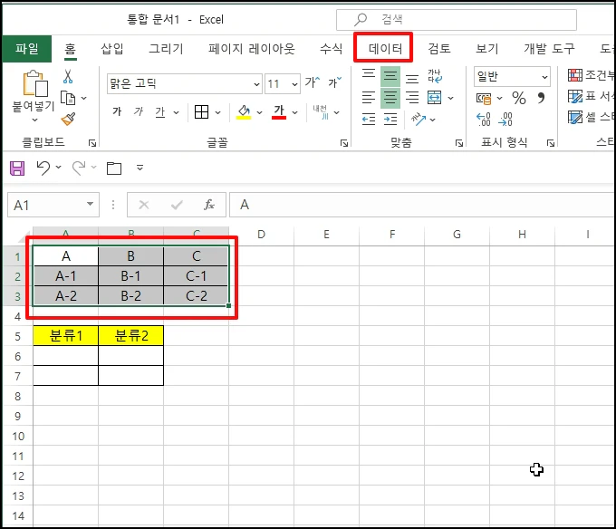분류1을 입력할 셀을 드래그해서 영역을 지정합니다.