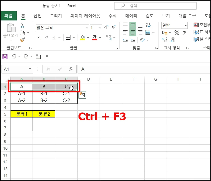 분류1이 입력된 목록을 드래그해서 선택합니다. "A1:C1" 까지 드래그 후 "Ctrl + F3" 키를 눌러주세요