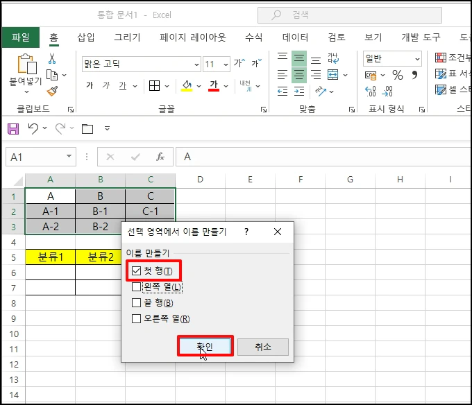 선택 영역에서 이름 만들기 창이 열리면 항목 중 [첫 행]만 체크 하시고 나머지 모두 체크 해제 후