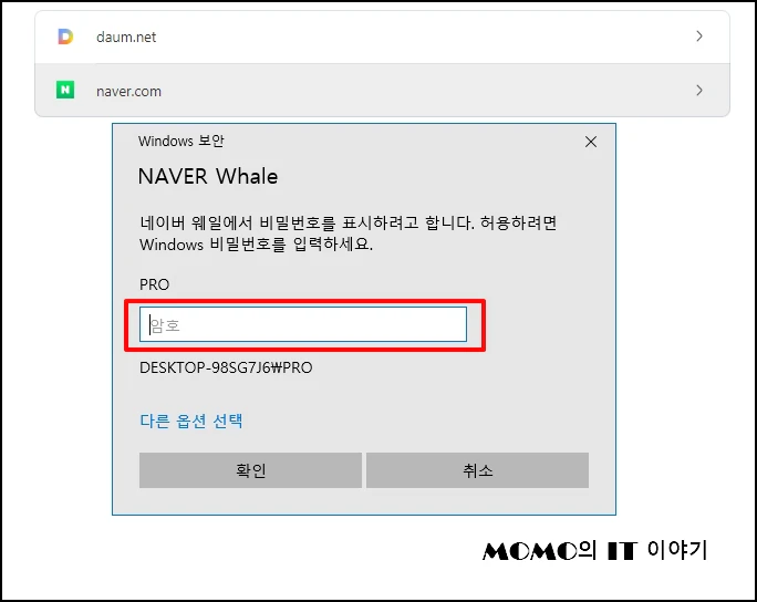 윈도우 비밀번호 입력 창이 나옵니다. 비밀번호를 입력해 주세요