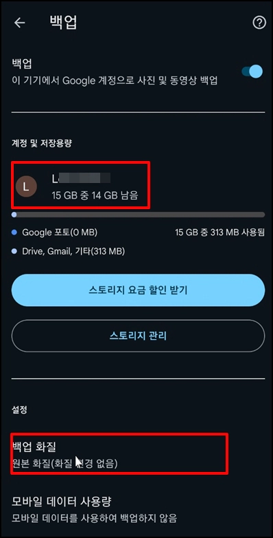 구글 포토에 남은 용량이 부족한 경우 백업할 사진의 화질을 설정해서 더 많은 사진을 백업할 수 있습니다.