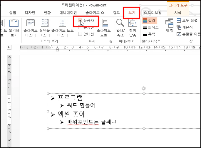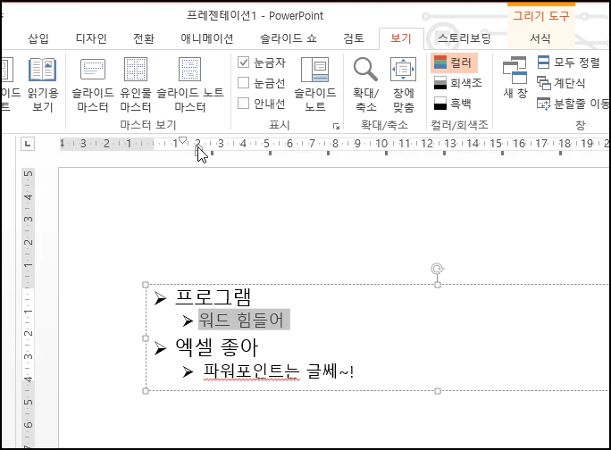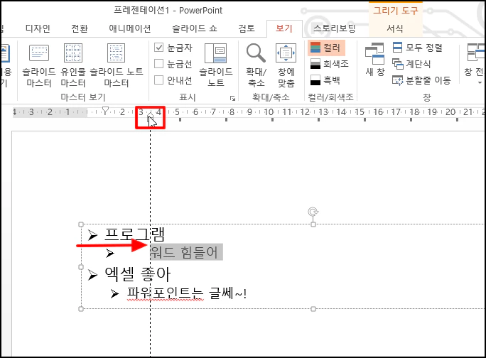글머리 기호와 글자 사이의 간격을 조정하기 위해 눈금자가 있어야 합니다.