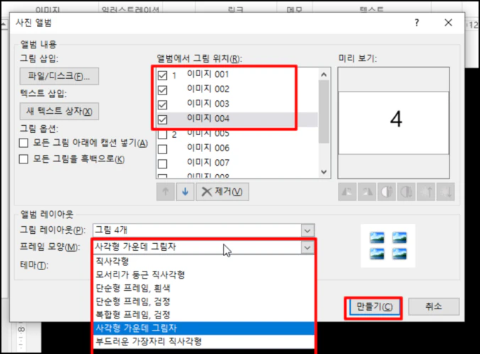 그림 레이아웃을 [그림 4] 개로 선택하시면 앨범에서 그림 위치가 슬라이드 숫자 1에 이미지가 4개 소속됩니다.