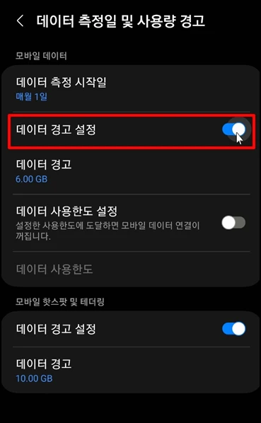 목록 중 [데이터 경고 설정]을 에서 [켬] 또는 [끔]으로 합니다.