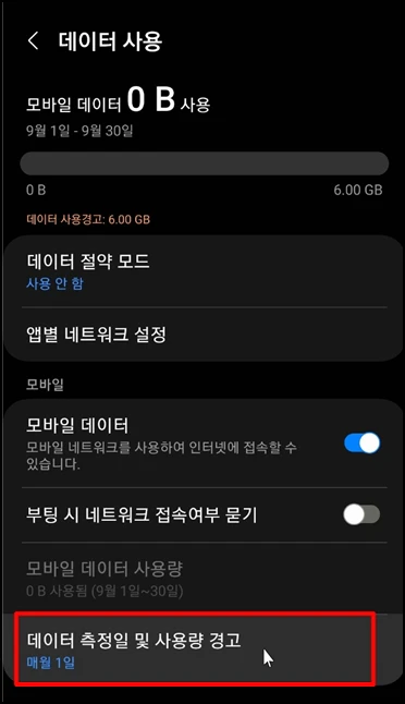 화면 하단 [데이터 측정일 및 사용량 경고]를 선택해주세요