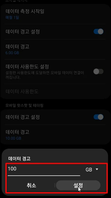 사용하는 데이터 용량을 설정하거나 100GB로 해서 알림을 끄지 않더라도
