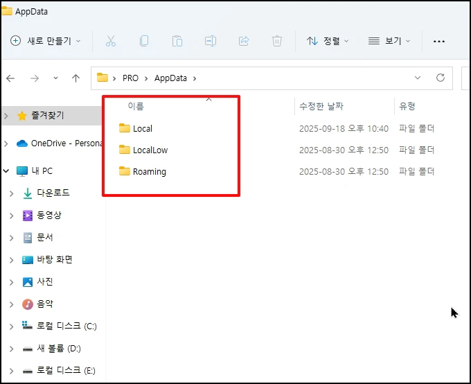 AppData 폴더는 윈도우 운영체제에서 프로그램 실행 시 필요한 데이터 설정
