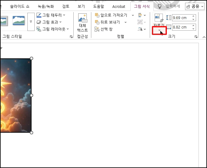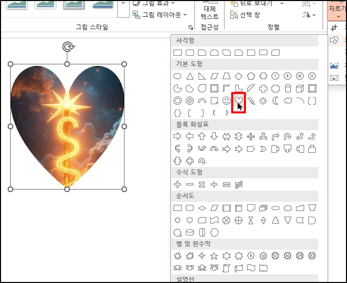 오른쪽 자르기 아래 있는 작은 화살표를 클릭합니다. 메뉴 중 [도형에 맞춰 자르기]를 선택합니다.