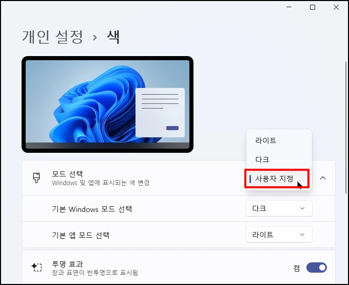 사용자 지정을 선택하신 분이라면 [Windows 모드 선택]은 반드시 [다크]로 설정합니다. 참고로 응용프로그램 모드는 별개로 두어 앱 창은 [라이트]로 유지하면서 작업 표시줄만 어둡게 할 수도 있습니다.