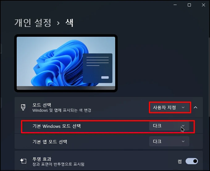 작업 표시줄 색상을 적용하려면 [기본 Windows 모드]를 반드시 [다크]로 설정해야 합니다.