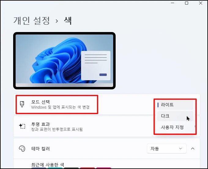 [모드 선택] 항목을 찾아 [다크]를 선택합니다.