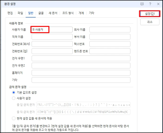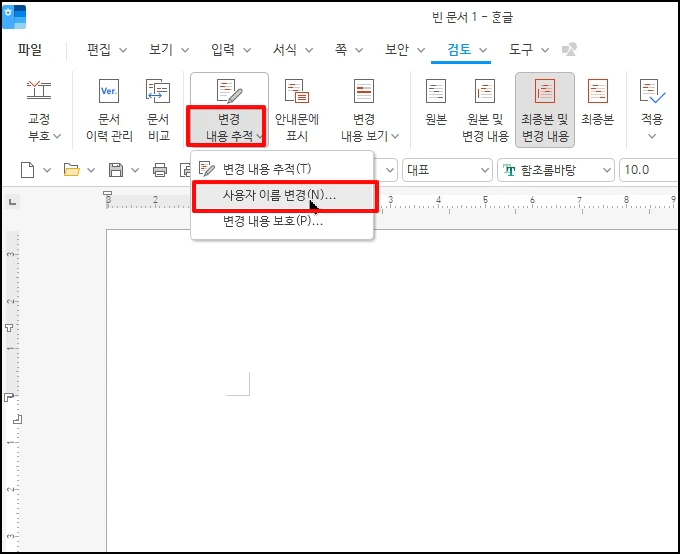 한글 프로그램에서 메모, 변경 내용 추적, 문서 속성 등에 표시되는 사용자 이름을 빠르게 변경하는 방법을