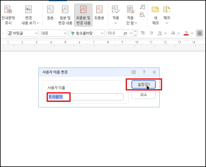 특히 변경 내용 추적에서 검토자별로 색상을 다르게 표시할 때도 이 사용자 이름이 기준이 되기 때문에 정확성이 필수입니다.