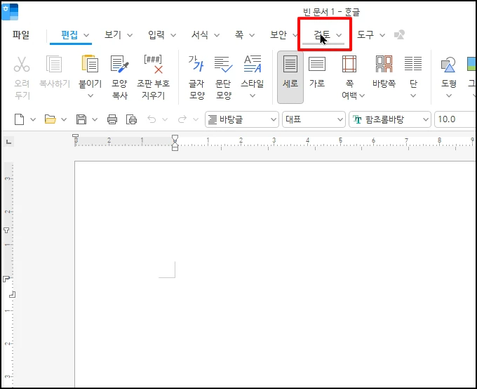 한글 프로그램에서 상단 메뉴 중 [검토]를 선택합니다.
