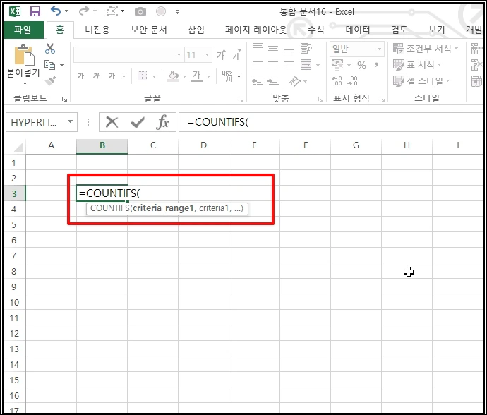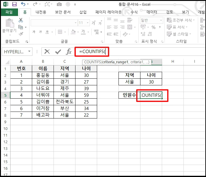 인원수글 구할 셀 선택 후 "=COUNTIFS" 함수를 입력합니다.